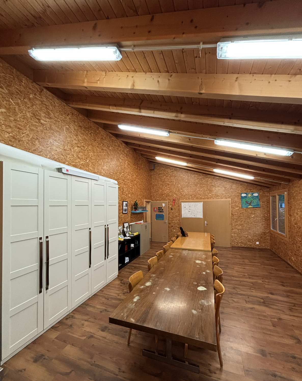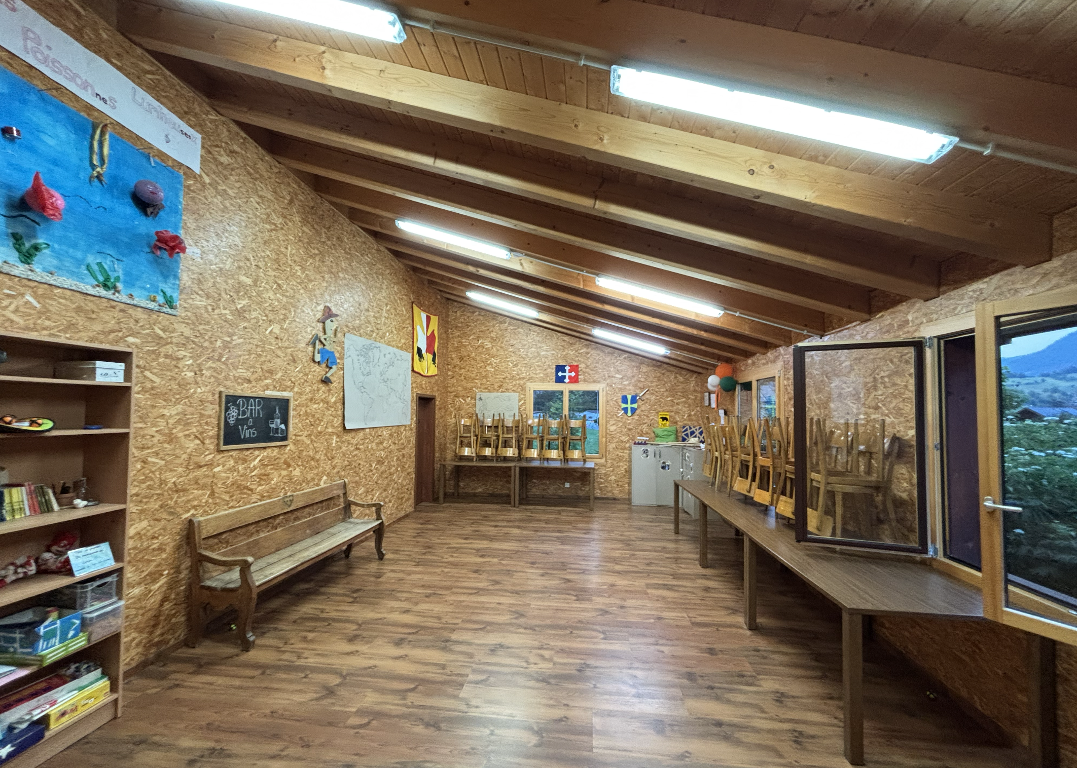 La location de la grande salle comprend la cuisine, les toilettes et deux salles, reliées par une grande porte qui peut être ouverte afin de créer une seule grande salle. Le prix de cette location est de CHF200.